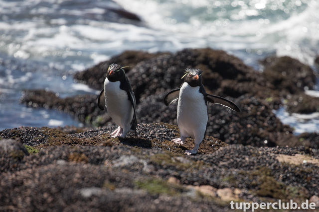 Die kleinen machen ihrem englischen Namen „Rockhopper“ tatsächlich alle Ehre, denn sie springen mit ihren riesigen Füßen mit Krallen steile Felsen hinauf, um dort auf naktem Fels zu brüten.